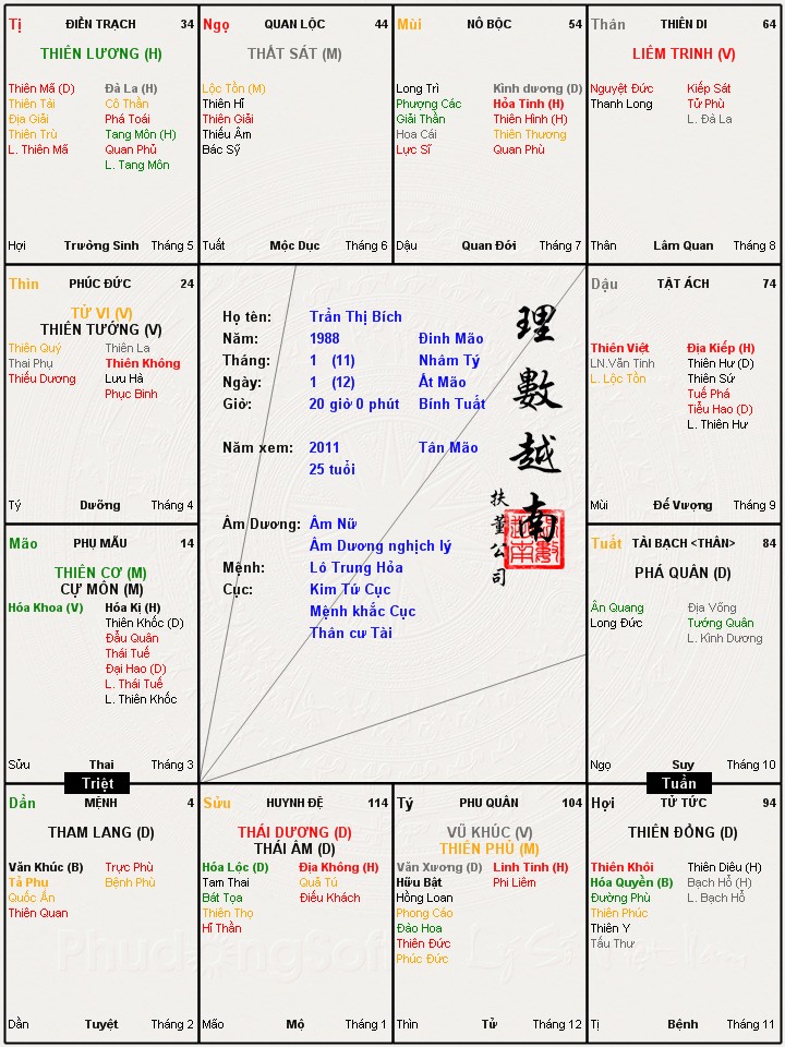 Anh năm Mão Mệnh sinh cục trước sau cuộc đời cũng có nhiều thuận lợi, Mệnh Tử Phủ là người trọng hậu, có tính sáng tạo nhưng cũng rất bảo thủ do Thiên Phủ ghìm bớt. Mệnh có Mã Khốc Khách nhưng không được Lộc Tồn coi như chỉ được con ngựa hay Thiên Mã, Mệnh Mộc sinh cho Mã hỏa nữa cho nên anh là người làm việc khi đã tập trung thì không biết mệt mỏi và rất chăm chỉ. Tuy nhiên anh cũng nóng tính do có Hỏa Tinh và rất chăm lô đề vì có Khách Hao, hjhj.