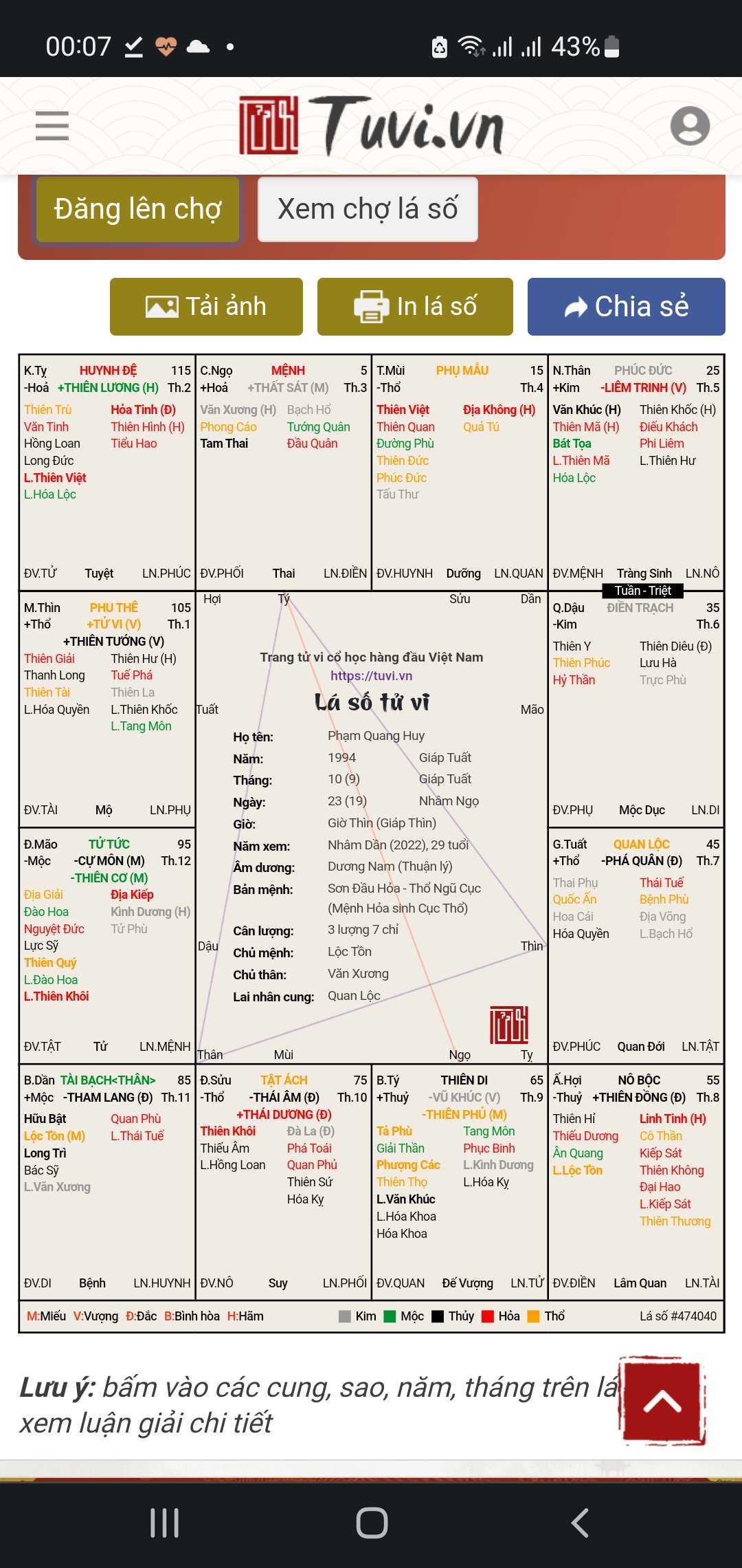 Cảm ơn bác, em up lại ls của em, em hiện đang kinh doanh riêng, tự lập từ sớm, muốn biết thêm về sự nghiệp, tài lộc, phu thê, và điền trạch. Em cảm ơn nhiều!TuviExpress đã viết: 21:03, 26/06/22Hiện bạn đang ĐV nào. Thử lấy lá số theo thầy Cường lyso xem. Ông cohoc hơi khó nhìn. Thất Sát ngưỡng đẩu cũng khá. Tài có Lộc mã giao trì ổn. Vợ hội Khoa Quyền Lộc. Nên nhờ gia đình, bố mẹ và vợ.monpham2310 đã viết: 23:03, 25/06/22 Xin chào mọi người,