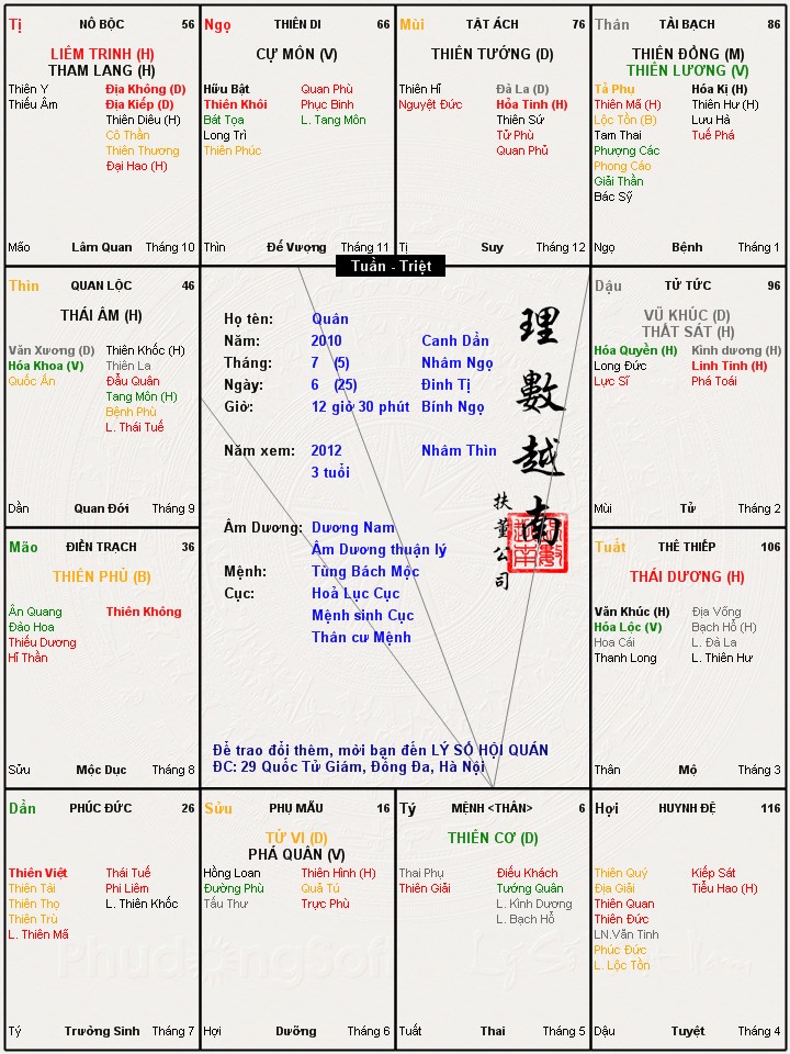 Em có lá số này nhờ các bác xem giúp! Có thầy Tử vi nói lá số này khó nuôi, hay gặp hạn,.... Nhưng e nhìn lá số khá đẹp, mọi người cùng chiêm nghiệm luận giải giúp xem liệu bé sẽ chịu những cái hạn gì?!!!