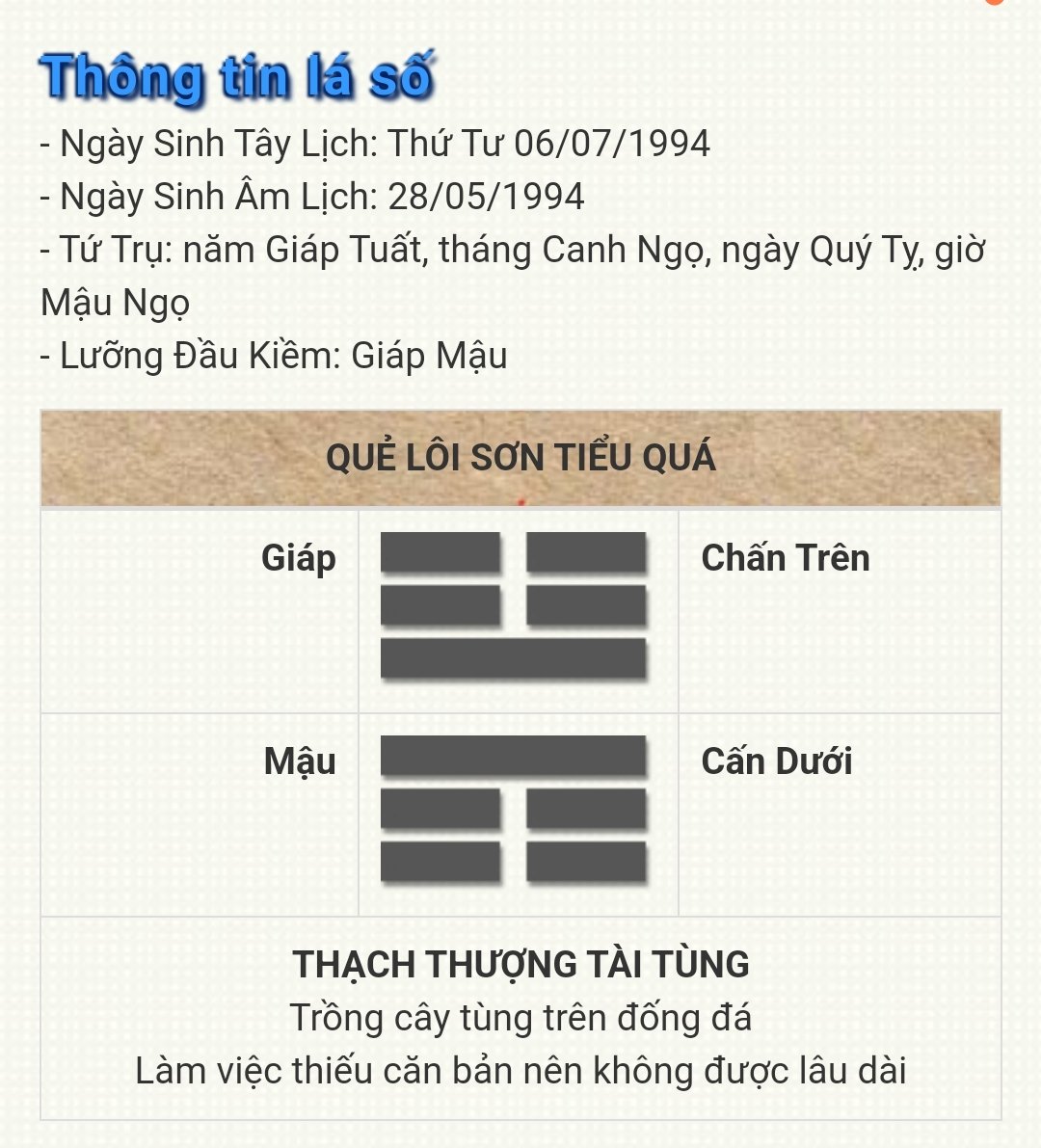 Dc cái bên họ có bà tổ cô linh thiêng độ trì , nhưng là họ bẻn ngoại chứ ko phải chính cung họ nội , nên cứ ngắc ngoải lại dc vớt và nuôi ý chí , nhưng cũng chỉ dừng lại ở đó chứ ko hơn , số vất vả công danh tiền nong .