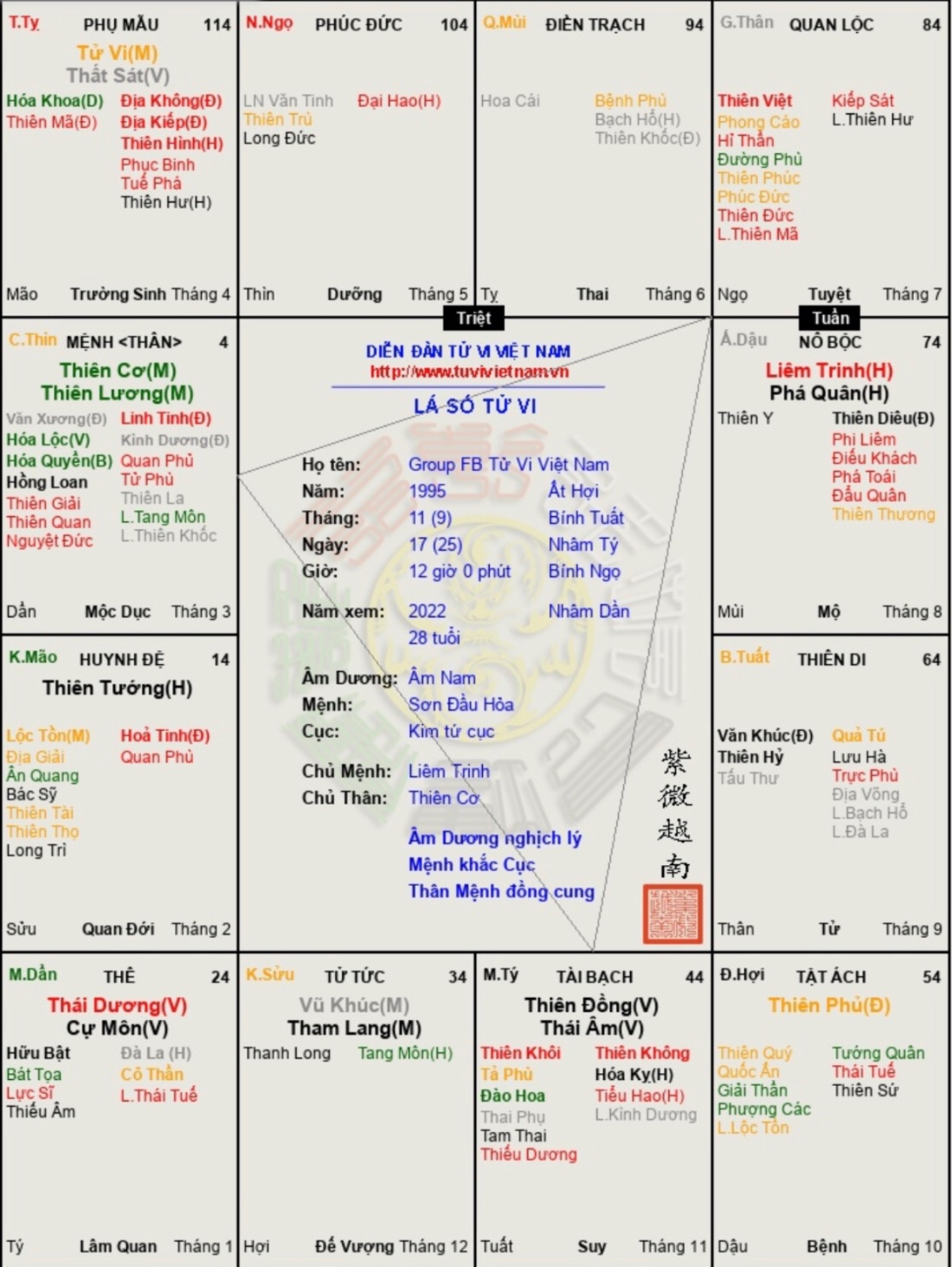 Em cảm ơn bác. Vợ sinh năm 95 bác ah. Lá số vợ năm 2023 có báo có thai, nhưng em cũng hơi lo lắng vì cung tử của vợ hơi xấu. Bác đã có duyên rồi có thể xem giúp em đường con cái được ko ạ十面埋伏 đã viết: 18:05, 04/10/22 Sinh tháng nhuận tốt nhất xem tứ trụ. Xem tử vi tính chính xác giảm đi so với tứ trụ là 30%. ( nếu thầy cùng trình độ như nhau)