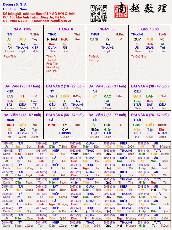 Sao lại bảo độ tin cậy không cao , nhìn đại vận tiểu vận năm đó toàn sát tinh nên mọi người đều nói vậy ...lá số này chính là a ruột của mình , cảm ơn bạn đã tham gia ...bạn đoán xem cha mẹ thế nàoTuviExpress đã viết: 21:32, 28/02/22Lá số này mà cưới đc năm 2006 thì độ tin cậy không cao. Bạn tả qua bố mẹ, công việc bạn này và trình độ để nghiệm lý nhé.Lão Bản QN đã viết: 20:50, 28/02/22 Mình xin công bố đáp án : duy nhất chỉ có yennamthien trả lời chính xác năm 2006 lấy vợ, trước khi cưới có bầu ...còn một sự kiến cùng năm đó là bà mất...năm 2021 đương số mua đất rồi xây nhà , còn lại chưa ai đoán đúng ....mình xin tất cả mọi người đã tham gia