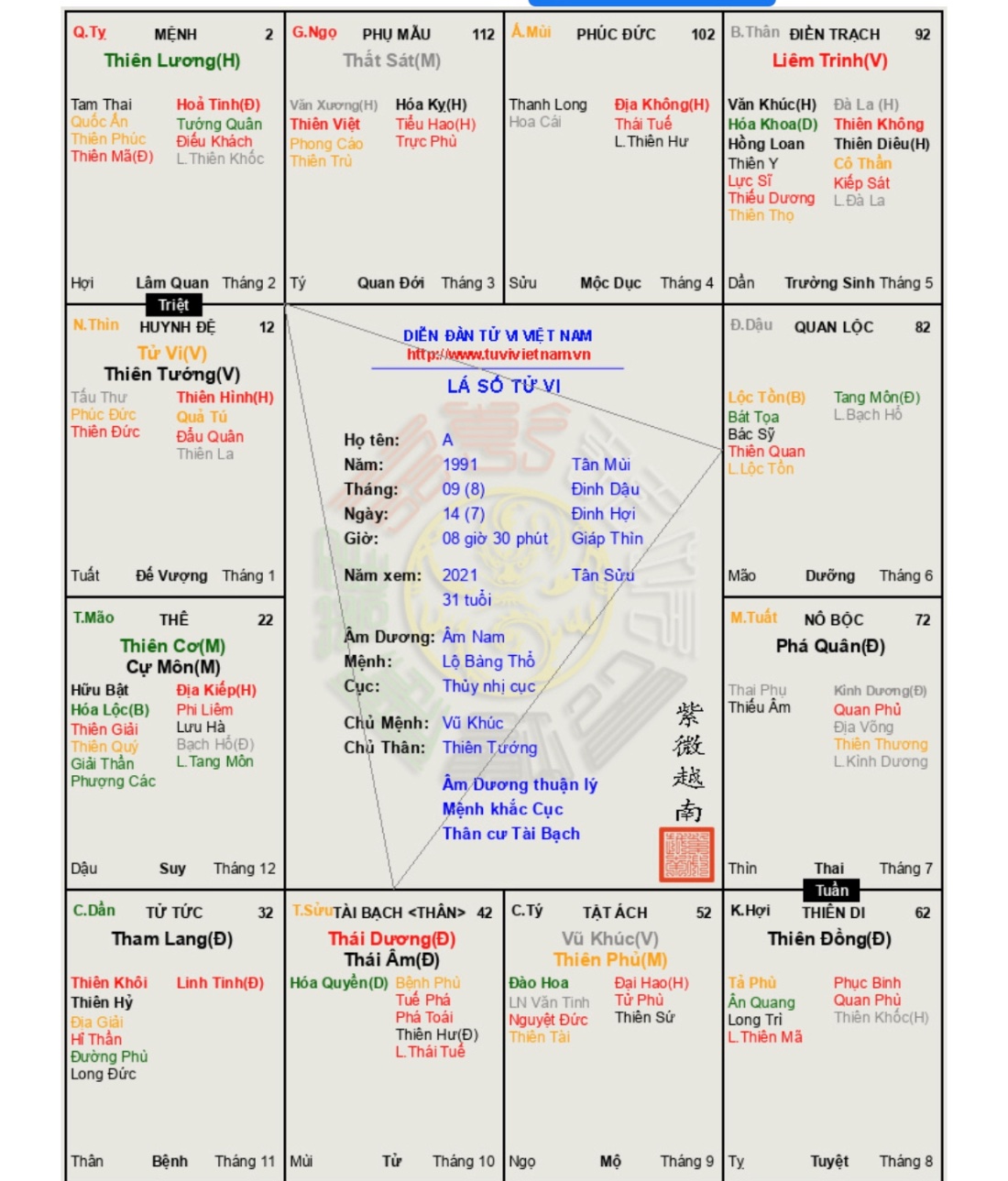 Chồng em đang làm nghề gì? Trình độ?Ng.mai91 đã viết: 10:54, 25/09/21Dạ vâng em cảm ơn ạ. Thế e cũng bớt lo hơn, chứ lúc đầu em cũng sợ ạ. Anh có thể cho em hỏi thêm là lá số con em có tốt không ạ? Còn chồng em thì liệu qua 30 có khá hơn k chứ lận đận quá anh ạhysshu đã viết: 10:50, 25/09/21Cấu trúc lá số giống nhau, nhưng 2 lá số này không thể giống nhau 100%. Chỉ nguyên cung Mệnh Thiên lương hãm: mệnh của bố bị Triệt; mệnh con bị Tuần, đại vận đi khác nhau. Khác nhau nhiều. Ko có chuyện lịch sử lặp lại.Ng.mai91 đã viết: 10:31, 25/09/21 Gửi mọi người lá số chồng em và con trai em ạ.