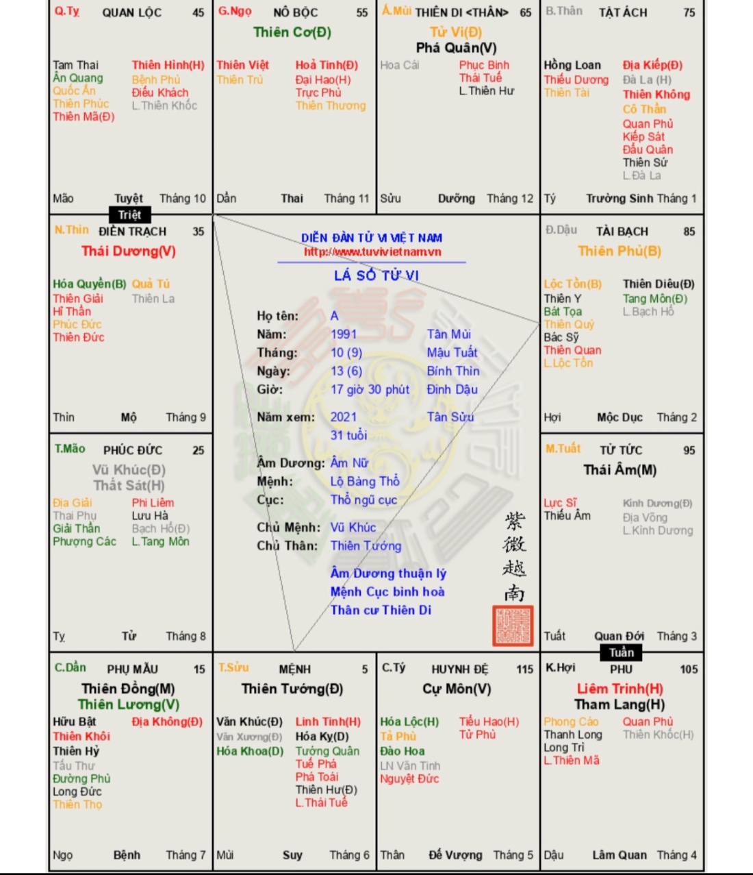 Dạ vâng cháu cảm ơn chú ạ. Chú ơi sau đại vận tức là sau 35t đúng k ạ? Với con đầu của cháu là con gái sinh năm Ất Mùi thì k sao đâu đúng k chú?dunglanchin đã viết: 16:52, 25/09/21 Ng.mai91 thân ,