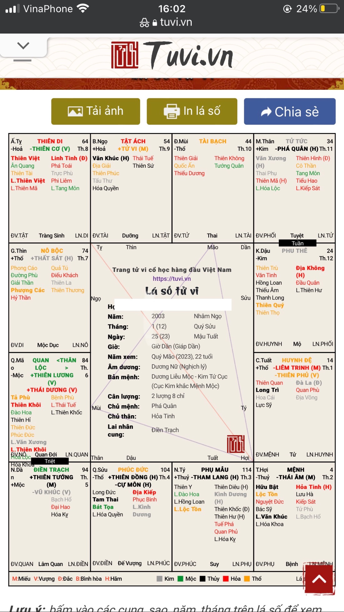 Dạ vâng. Hy vọng gặp đc ạbegauhn đã viết: 19:47, 21/06/23Ở Vn hiện nay chỉ có duy nhất 1 người nhìn mặt đọc ra giờ sinh , tuổi chính xác của người đến . Mà k cần cung cấp bất cứ thông tin ghì . Đọc tuổi người sẽ kết hôn , hoàn cảnh gặp , giờ phút tai nạn ..v..v...Như12 đã viết: 09:24, 21/06/23 Dạ cho em hỏi liệu đây có phải lá số của em không ạ ? Tại nhà em hỏi h sinh thì mọi người trả lời không được thống nhất ? Nếu không phải giờ sinh trong ls này là giờ em sinh thì vậy em vốn vào khoảng thời gian nào ạhuhu cung điền trạch của em xấu quá, em cảm thấy chỗ nào, cái gì tốt thì lại gặp triệt, mệnh có hoả tinh, quan lộc, điền trạch gặp triệt mà tài bạch là vcd, phu vs tử tức cũng bị tuần