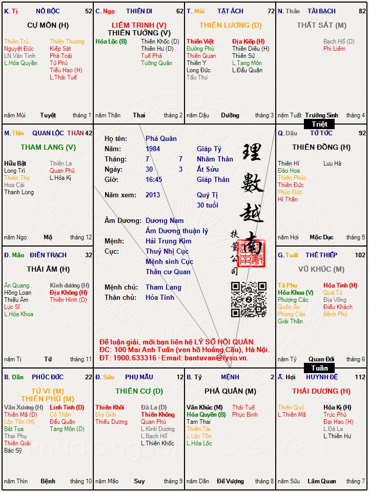 Ông tướng, lá số đẹp, thời vận có vẻ đẹp. Tự nhiên chình ình ra 2 con Hỏa Linh trên đại vận, há há. Cuối cùng vận 16-25, thay vì dùng không kiếp bỏ nhà đi bụi, thì ông tướng lại dùng linh tinh ngồi học tử vi và đi chém gió trên lý sốcuondajde16 đã viết:Cậu cứ coi thử đi... k sao đâu... quan trọng gì...