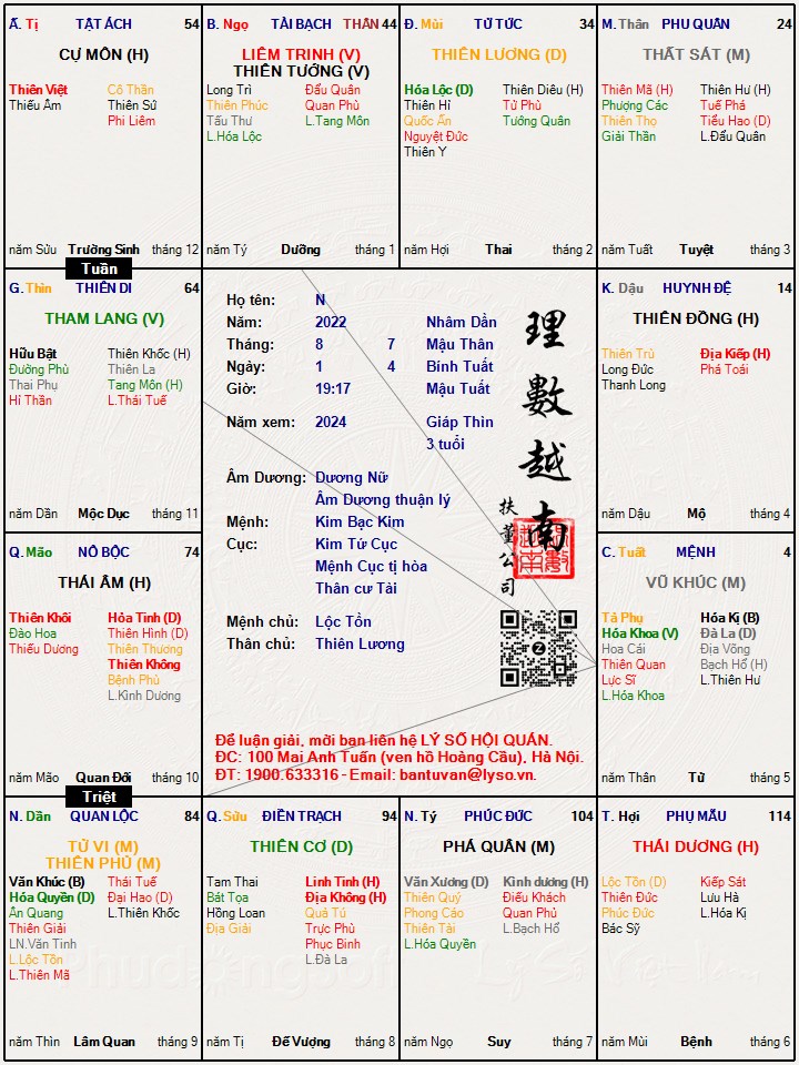 Mẹ SuBi đã viết: 05:32, 14/03/24 Em thấy bảo con trai e mệnh xấu, phạm kim xà thiết tỏa( bé trai, sinh 05/02/2016 - âm lịch; Mẹ sinh 31/7/ 1987, bố bé sinh 08/12/ 1983 - dương lịch). Giờ em bất an quá. Em sinh mổ trong giấy sinh bs ghi 10h30 sáng. Đây là lá số của con em ạ. Các bác làm ơn xem giúp em với. Em cảm ơn ạ