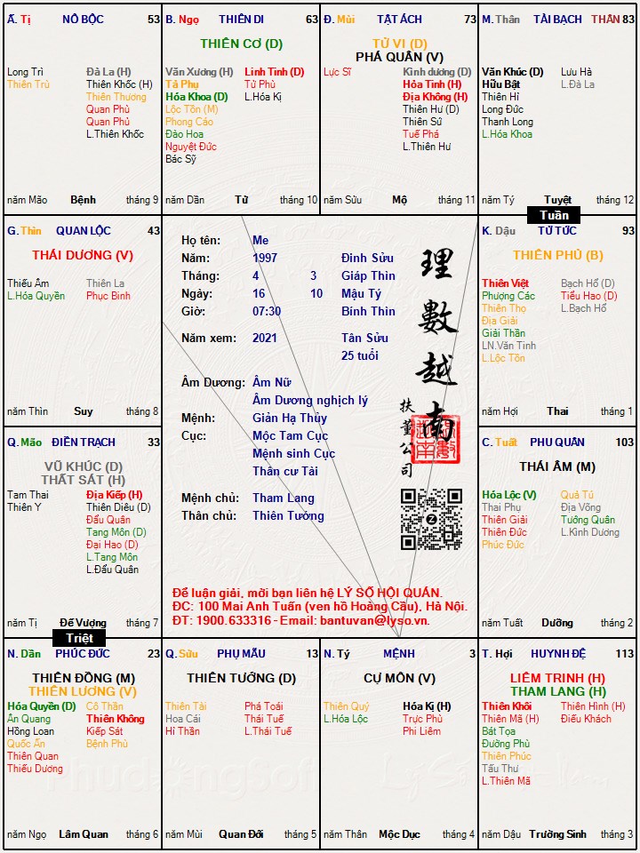 Năm nay 25t lưu đại hạn , tiếu hạn trùng phùng ở cung mùi có Tử Phá ở tứ mộ , giáp Tả Hữu thì mọi việc đều thuận , các tháng cuối năm ( 10 , 11 , 12 âm ) cũng thuận , chỉ có tháng 10 có cản trở một chut vì có thiên không thôi .