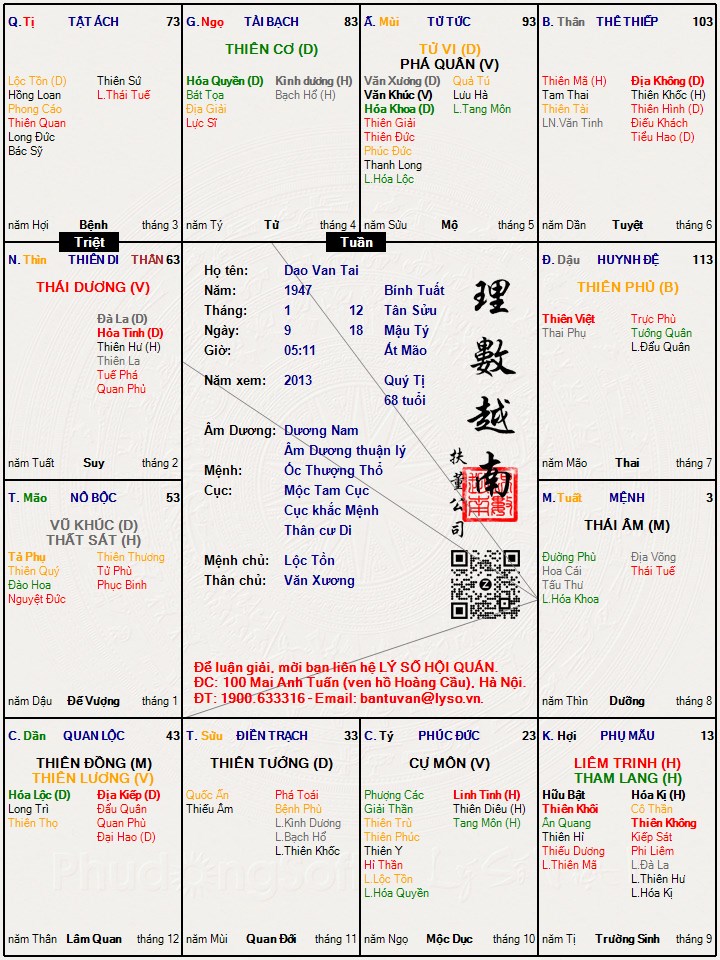 cung tật ách có triệt là người có sức khoẻ tốt suot đời ko bị bênh tật năng gi cả. Thiên Lương, Thiên Đồng ở Dần hai phúc tinh ở hai vị trí này rất đắc cách càng biểu lộ tính nhân hậu, từ thiện, bác ái, sẽ không gặp tai họa nào hung hãn, được thần linh che chở.lá số này thì đúng là trong họ có nhiều người khá giả. quý hiển, nhưng hay chết non.Những người khá giả hay đoản thọ.nhưng đung là năm nay tức 2013 (Quí Tỵ) có hạn