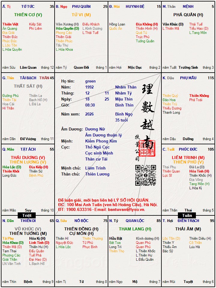 chú này có bản tính khá đàn ông nhẩy, nhưng cung thê của chú như rứa thì cứ phải ngoài 30 hãy nghĩ đến vợ, chú có muốn cũng chả đến đâu. lấy rồi cũng xa cách tình cảm lắm, chỉ có đi tìm phở thì may ra mới có tí mặn nộng thôi. cung tài bạch của chú là số làm quan chỉ ung dung ngồi nhận phong bì, có gì phải lo nghĩ.