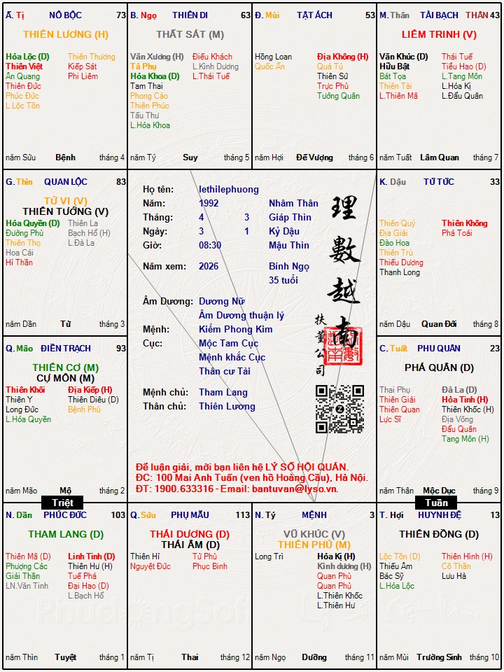 em tên lệ phương, sn 1/3/1992 âm lịch ,sinh giờ thìn (8h30 sáng), nữ và ở bắc VN.