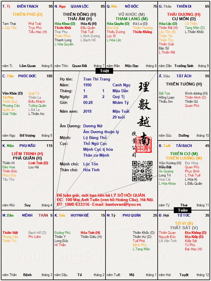 Em chào các bác/ anh/ chị / bạn trong diễn đàn tử vi lý sô. Em là thành viên mới trong diễn đàn. Em tên là Trang, sinh năm 1990 canh ngọ. Năm nay đã 29 tuổi mà sao vẫn lận đận đường nhân duyên và công việc thì vẫn lênh đênh quá. Kính mong các bác ghé qua xem giúp em xem bao giờ em lấy được chồng ạ. Và cuộc sống hôn nhân của em thế nào ạ. Đây là lá số của em ạ. [img][/img]https://lyso.vn/lasotuvi/2018/3AXNUXOV.jpg[/IMG]