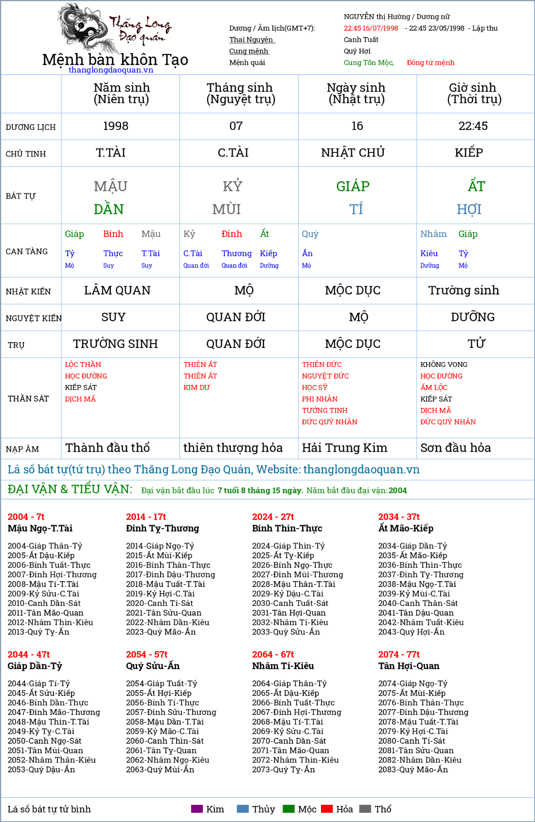 Liên đã viết: 14:39, 16/07/22 Theo tôi mệnh thân thì không xấu, nhưng hạn thì xấu từ 19 đến 21 tuổi dễ hư sự hư việc không được như ý, dẫn đến buồn phiền, hay lo nghĩ dễ làm thần kinh căng thẳng, tính cô độc cao khó tìm được người tâm đầu ý hợp, hay bị kẻ khác chống đối bản thân khó tránh ấm ức, có lúc thì vùng lên nhưng có lúc lại nín nhịn trong lòng. Nói chung không tốt cho công danh sự nghiệp và cả chuyện tình cảm, khó tránh buồn phiền trong lòng, nên dẫn đến tự ti thôi. Hạn từ 22 đến 25 tuổi cũng còn xấu bất lợi cho công danh sự nghiệp và chuyện tình cảm, cứ đi làm công ăn lương thì đỡ, tránh kinh doanh, trong cuộc sống hay công việc tránh sai luật. Từ 26 trở đi tốt lên từ công danh đến chuyện tình cảm.