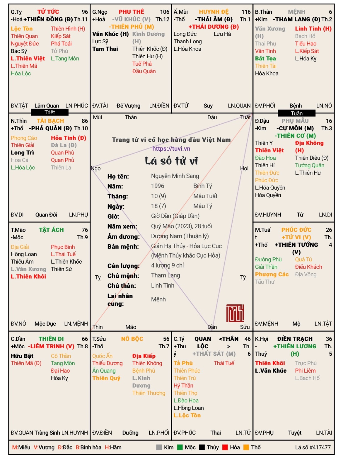 Dạ vâng, cháu xin lỗi vì up nhầm bản lá số đã che thông tin! Cháu xin phép up lại bảng lá số đầy đủ thông tin ạ! Mong bác dunglanchin xét giúp cháu về đường công danh sự nghiệp và đại vận cần lưu ý trong đời ạ! Cháu xin cảm ơn bácdunglanchin đã viết: 11:09, 18/07/23Tuvi90 đã viết: 15:19, 17/07/23dunglanchin đã viết: 11:27, 31/05/23