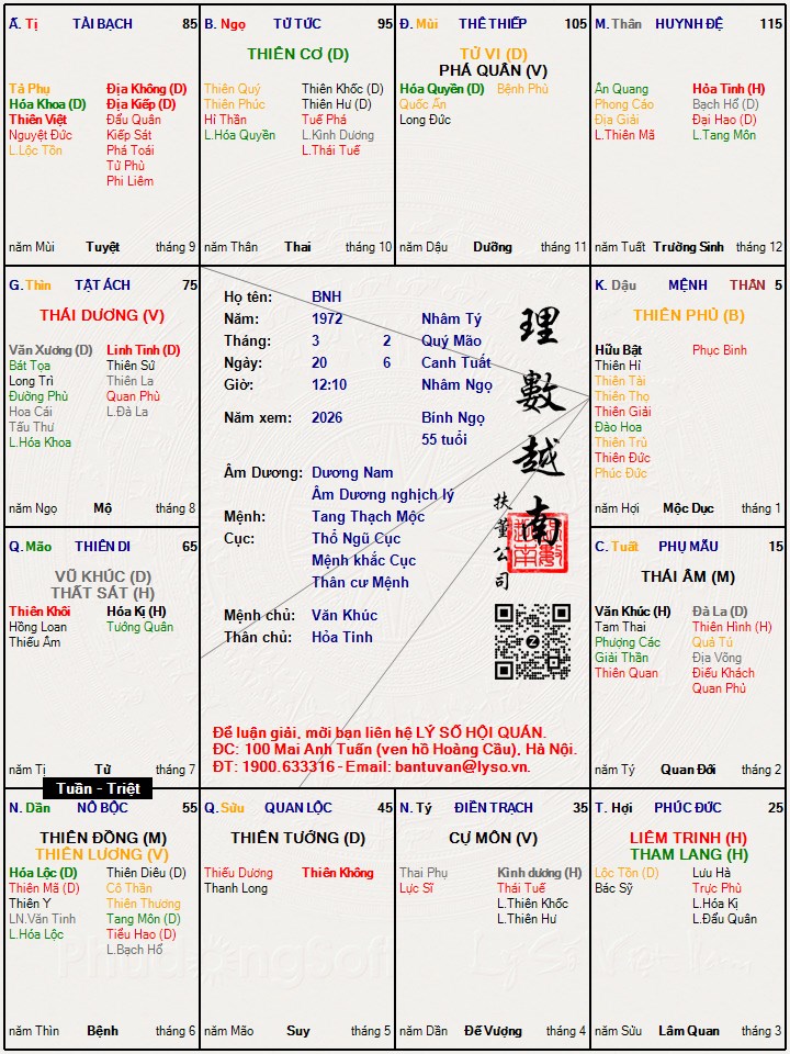 Mệnh thiên phủ mà bình hòa thì làm sao béo được, nhưng sau khi có con thì sẽ có da có thịt. Bở Thiên phủ không có hãm địa, nhưng gặp Kinh dương là gặp cướp rồi nên dù đủ ăn cũng thành túng thiếu. Người không béo cũng là bình thường.Thienphu84 đã viết:Xin chào bác KhucTham, cho phép cháu gọi là Bác vì cháu sợ thất lễ nếu bác nhiều tuổi rồi ạ. Khi cháu biết đến Tử Vi, cháu thấy tử vi thực sự là một khoa học thật huyền bí. Lâu rồi mới thấy có cao nhân trở lại. Cháu vào diễn đàn xem đã đọc những bài luận của bác KhucTham cho mọi người rất hay và cháu rất khâm phục về kiến thức tử vi của Bác. Hôm nay cháu kính nhờ bác xem dùm cháu lá số, chổ tốt xấu gì thì bác cử thẳng tay xem giúp cháu. Tốt thì sẻ phát huy thêm, còn nếu xấu thì cháu cũng biết mà kiềm chế khắc phục. Cháu thiết nghĩ có khi bác rất bận rộn nên không dám trông mong nhiều ạ, chỉ mong bác dành chút ít thời gian xem giúp cháu ạ cũng là cơ hội để cháu mở mang kiến thức thêm ạ.