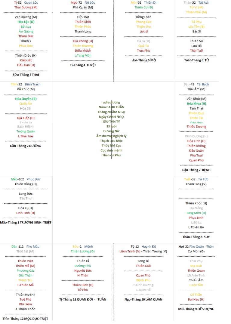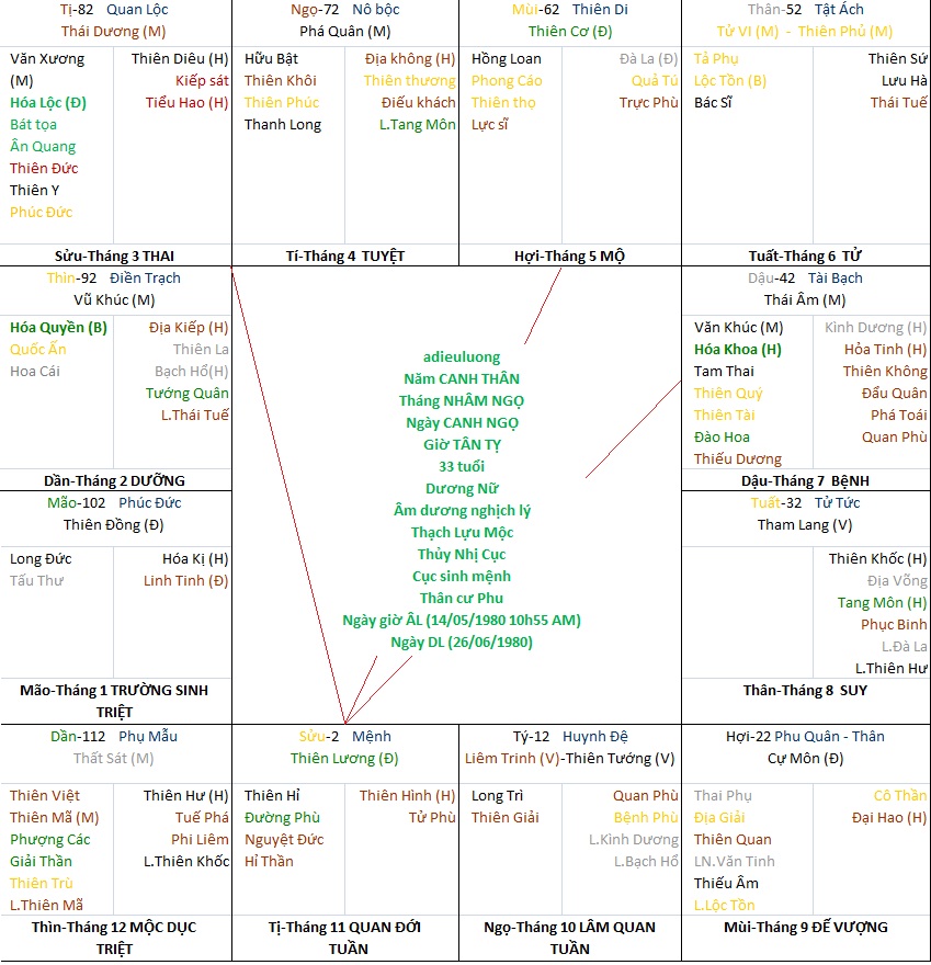 Adieuluong , cháu trình bày lá số khá lạ mắt . Để cho dễ xem , cháu có thể mượn lá số Hoả Cục và sửa trên lá này không ? Nếu vì lý do nào đó cháu không thể thì cháu làm mầu sắc đậm thêm cho các chi tiết trong lá số cháu đã bỏ công ra thực hiện nhá .