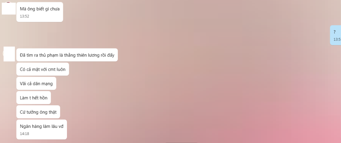 Cho hỏi từ admin hội nhóm ly so trên fb. Tôi rời nhóm từ bao giờ.tiennguyen1445 đã viết: 18:18, 25/01/18 Nếu anh nói có người mượn danh anh sao anh không lên tiếng mà im lặng để mọi người nghi ngờ. Tiền từ thiện chuyển đến tài khoản ATM của anh, anh không thấy thắc mắc. Từ khi kêu gọi từ thiện đến nay cũng gần 1 tháng, không có lời nào thanh minh. Nếu anh biết người mượn danh anh mà anh không lên tiếng cũng có nghĩa là anh bao che cho người đó phạm tội. Đúng là nhờ người khác xem tử vi phải trả phí, tôi ko phủ nhận điều đó. Nhưng lập stt nói là xem để ủng hộ từ thiện mà tiền không được đem giúp bà cụ thì có còn ý nghĩa gì nữa. Nếu anh nói anh không có gì sai thì mong anh hãy nói rõ là khoản tiền chuyển từ thiện ấy khi nào tới tay bà cụ vì 1 phần nó đang nằm trong thẻ ATM của anh mang tên anh. Anh không cần post CMND lên làm gì vì tôi FB tên DS..... có kèm ảnh của anh rồi. Vì không liên lạc được với anh nên tôi mới bình luận vào đây. Mong anh trả lời giúp. Còn việc kiện tụng tôi không nghĩ đến điều đó nên có CMND của anh cũng đâu để làm gì.