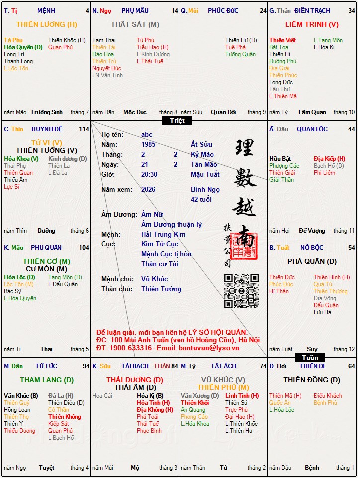 bavivi đã viết:Cháu là nữ, sinh ngày 10/02/1985 (dương lịch), giờ sinh: 17h35, tại Hà Nội.