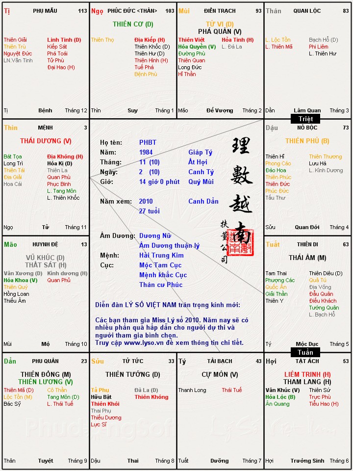 Đây là chuyên mục dành cho việc xem lá số tử vi. Các bài mang tính trao đổi học thuật xin vui lòng đăng trong mục Kiến thức tử vi.