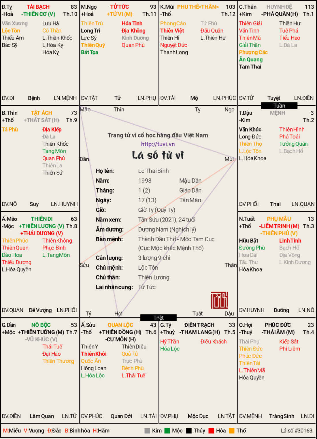Kính nhờ quý anh/chị/cô/bác xem giúp cháu lá số mệnh VCD của cháu bên dưới ạ, sắp tới cháu sẽ ra trường và đi làm. Chỗ công ty thực tập cũng đã có ý muốn cháu ở lại, và cháu hiện tại thực sự cũng hài lòng với lĩnh vực tại công đó. Tuy nhiên gần đây có lời mời rủ của một người anh bảo cùng người anh đó ra HN làm việc, cùng nhau kinh doanh. Và cháu cũng đang phân vân giữa hai lựa chọn này, vậy nên kính nhờ mọi người cho cháu lời khuyên ạ, hiện cháu đang ở ĐN với gia đình. Cháu cũng mong quý anh chị xem thêm 1 số vấn đề tương lai của lá số này ạ như tình hình tài chính, gia đình sau này.