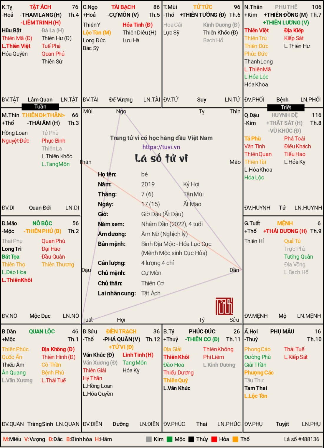 Em xin chân thành cảm ơn.nguyenhunganh2006 đã viết: 11:48, 18/08/22 Theo ý Tôi: về lá số của cô bé gái không khắc gì với cha mẹ bé cả, mệnh Thái Dương có Hỏa Tinh chiếu về cũng nói lên bản tính rất nóng nảy cọc cằn, Thiên Hình chiếu về nữa nếu đã qua mổ xẻ thì coi như thoát nạn, ngán nhất con Địa Không chiếu về cho cả Thái Dương và Lộc Tồn.