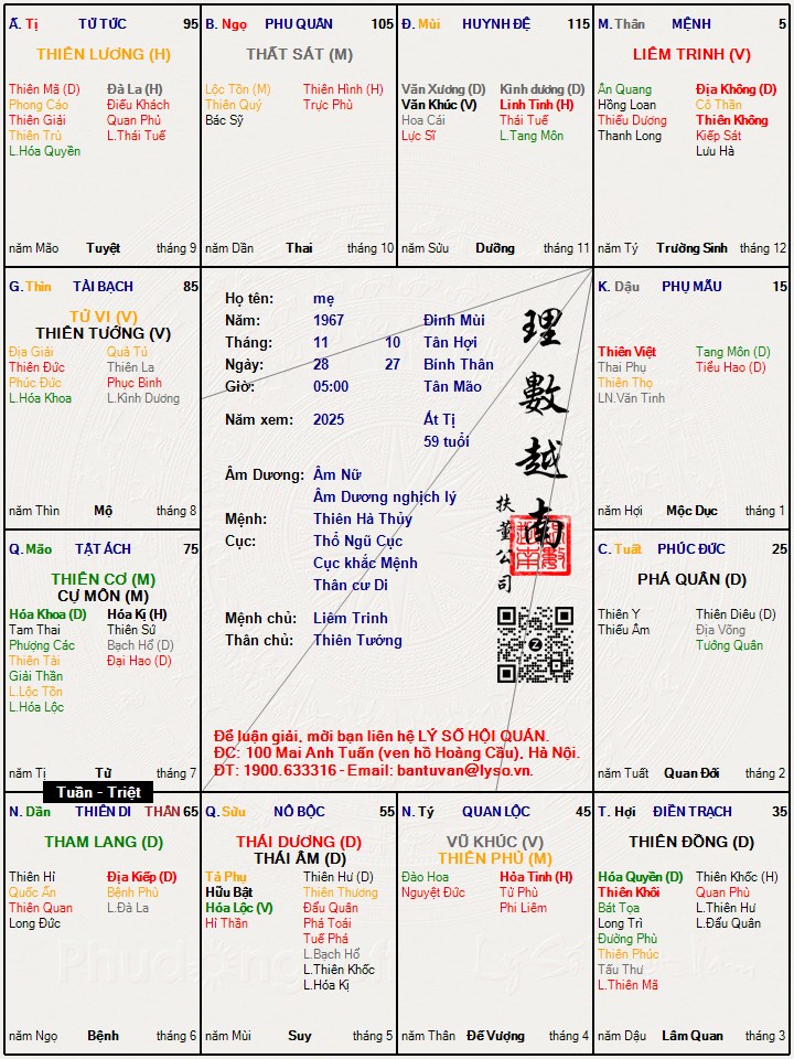 Lá số mẹ cháu: 5h Giờ Tân Mão, ngày 28/11/1967 (DL)