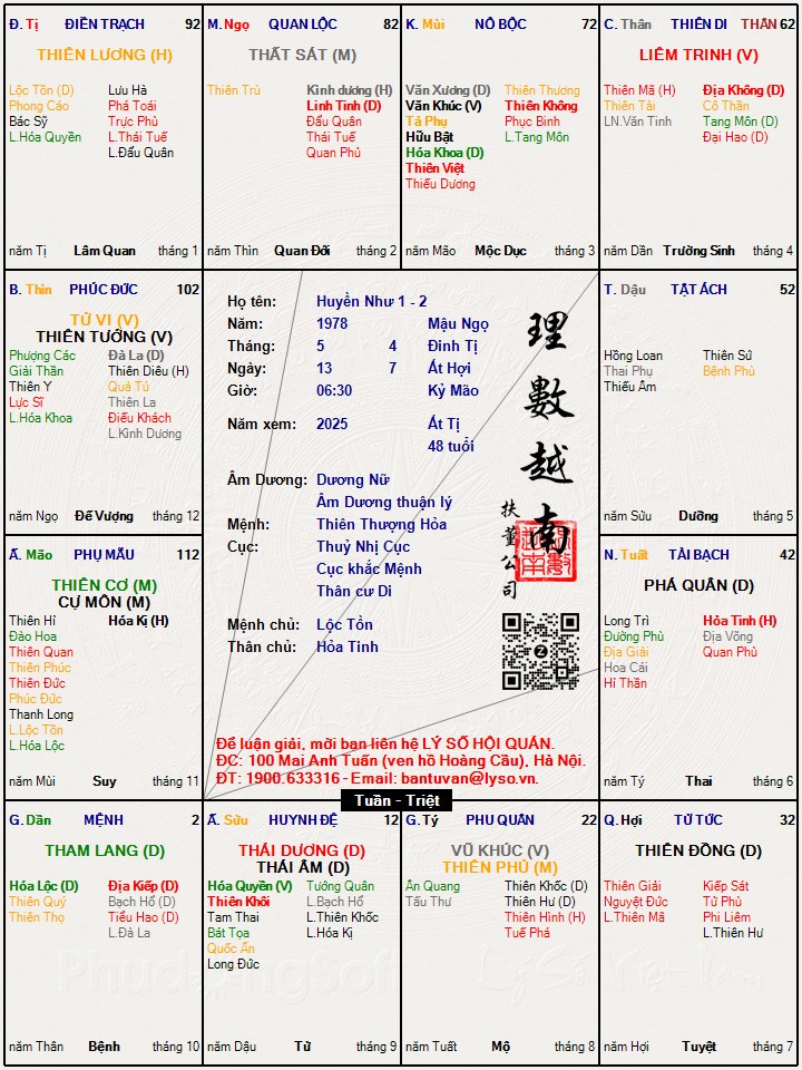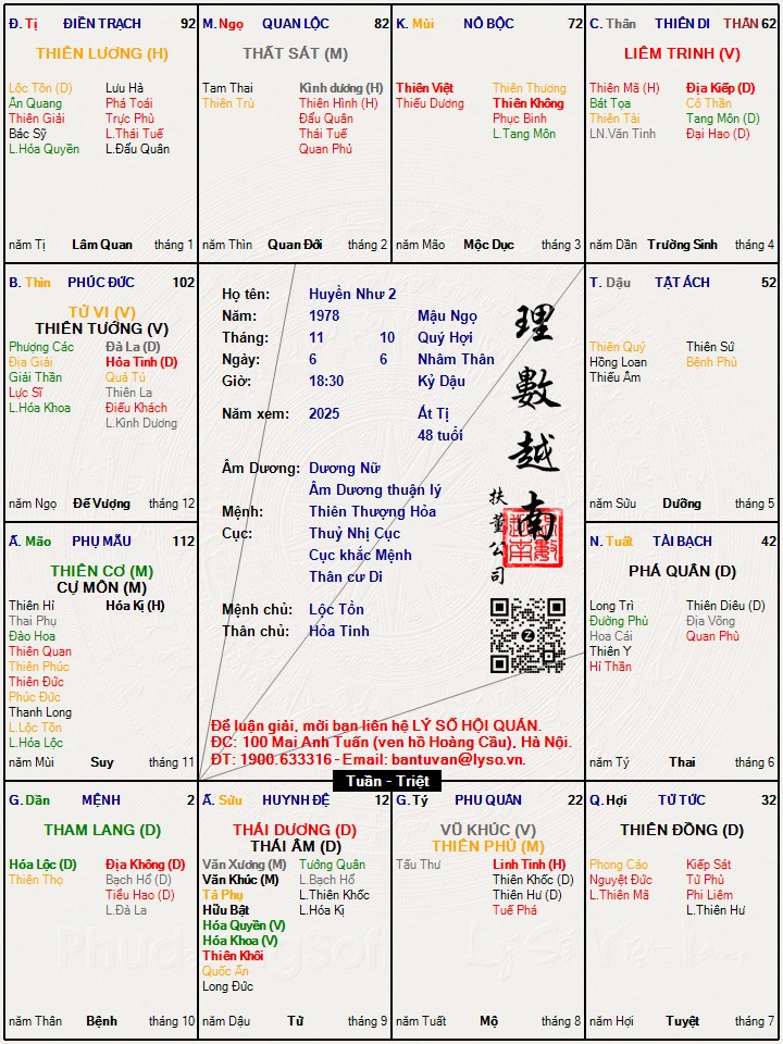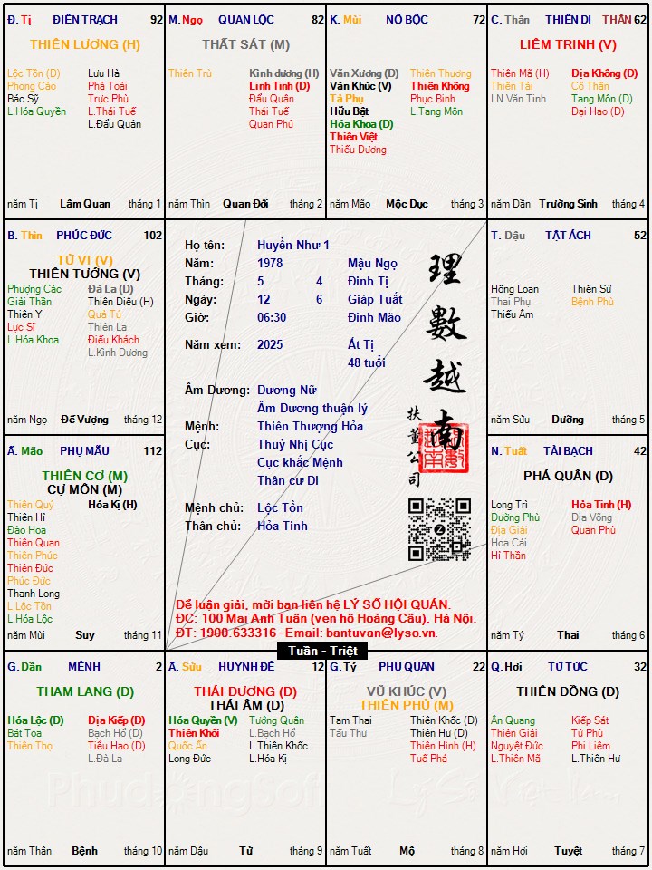 Như vậy là có 12 LS, 1 con số khá lớn. Tuy nhiên, ta thấy rằng, Huyền Như là người cơ mưu, chủ động, thành công từ rất sớm. Thậm chí khi thiệt hại cũng rất chủ động (sinh con, tẩu tán tài sản). Vậy mệnh chỉ có thể trong tam hợp thái tuế.