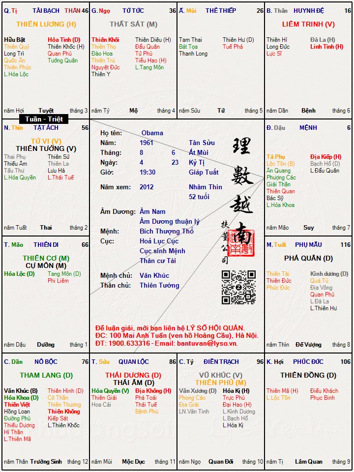 Lá số chồng chị thì cũng hơi giống lá số mà người ta cho là của Obama 1 tẹo (https://lyso.vn/lasotuvi/1/193004 ... 0Obama.jpg" target="_blank), chị nghĩ lá số Obama mạnh hơn (tất nhiên nhỉ), vì có Lộc Quyền, kiểu có quyền cao chức trọng, vàng ngọc đầy nhà, menh Obama thì VCD có Cự cơ song lộc chiếu sang, còn chồng chị thì Menh cự cơ song hao mão dậu, ko VCD tuy nhiên có nhiều văn tinh hoá khoa hội về nên có vẻ rất thích tìm hiểu học hỏi triết học, tiểu thuyết, nghiên cứu khoa học, nghiên cứu robot kỹ thuật, đi làm thấy công việc dễ dàng. Tuy nhiên thấy có điểm lý thú là chị thấy hình dáng gương mặt của chồng chị na ná Obama, vừa cao vừa gầy, trắng hơn Obama nhưng đen hơn chị