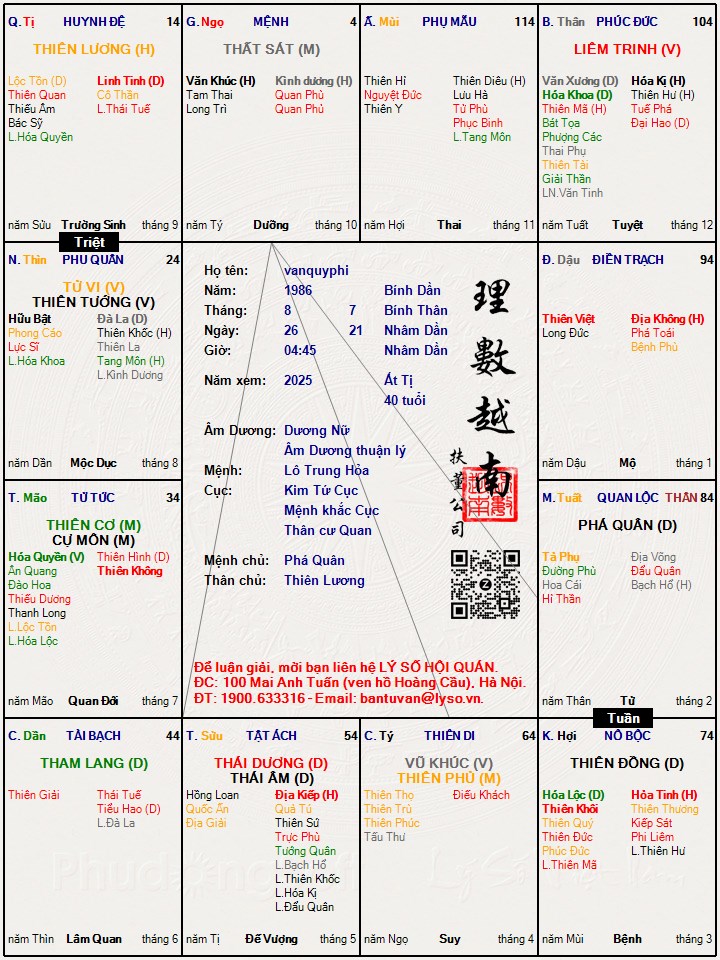 [/quote]Cô thiên đồng thủ mạng, quyền long phượng hổ cái hội tụ thì khá đẹp gái, lại dịu dàng dễ mến nhưng khá tự cao. Thiên đồng vốn là sao phúc thọ, thân cư quan có thiên cơ hội long phượng kình đà hỏa cũng là cách của người có duyên với đạo Phật. Tuy nhiên nghiệp chướng về hôn nhân của cô khá nặng, cung phu bị kình dương địa kiếp tang hổ xâm phạm, lại bị tuần triệt đồng cung thì hôn nhân rất trắc trở. Đây là do kiếp trước cô làm mẹ chồng, bắt con trai cô ly dị vợ làm con dâu cô và con nó khổ sở đói khát, thù oán đến bây giờ, vong linh con dâu của cô không đi đầu thai, đeo bám theo cô trả thù ngăn cản phá rối tình cảm của cô. Không những thế, nó còn oán cả đường con cái của cô, cô sau này sinh đẻ rất khó khăn, cũng may thời nay có nền y học hiện đại nên cũng không đáng lo ngại. Cô khá hiếm con và nuôi con sẽ vất vả.