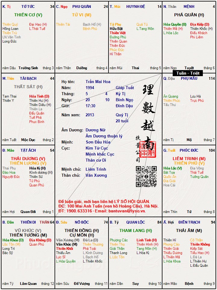 E sinh lúc 5h30 chiều ngày 20/5/1994 lịch dương , đây là lá số của e