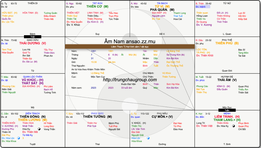 Mệnh nguyên cục là là Liêm Tham rất nhạy cảm với các thú vui bên ngoài lại thêm Đại Vận này có rất nhiều sao đào hoa vây chiếu lại có thêm Thiên Lương, Thiên Hình, Văn Xương hoá kỵ nên cần phải chú trọng gìn giữ bản thân, đừng để sa đà vào những mối quan hệ hoặc những thú vui không đáng có nếu không cái giá phải trả là rất nặng nề.