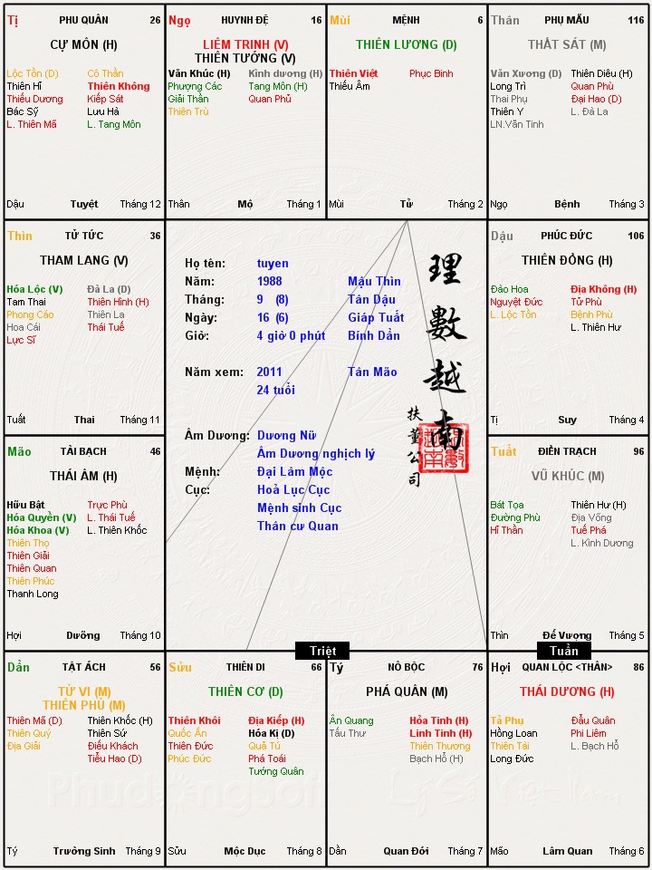 Năm mão 2011 cung nhập hạn là cung nô có tam hóa liên châu và nhiều cát tinh hội chiếu, sẽ có sự thăng tiến về tài lộc công danh, nhận được nhiều sự giúp đỡ từ bên ngoài. Mưu sự dễ thành, tuy nhiên không phải do thực tài của mình. Cố tu nhân tích đức nhé.