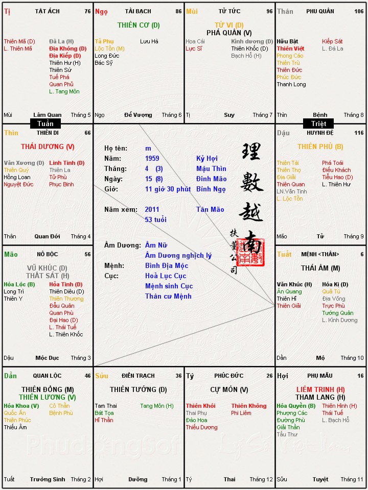 dongphuonghuyenbi đã viết:Dạ, chào bác Tây Đô, bác xem cho cháu lá số của ng này đc ko ạ. Người này sống rất tốt, đạo đức vô cùng, luôn làm điều thiện, nhưng số phận thì quá khổ. Giờ thì ng này bỏ chồng rồi. Bác xem thử từ giờ về cuối đời người này có an nhàn, sung sướng không, vì cả đời đã vất vả, chỉ mong từ đây về sau được an tịnh. Có một điều nữa là cháu nhờ bác xem thử ng này còn khả năng kết hôn nữa không, và có số ra nước ngoài hay không hả bác?