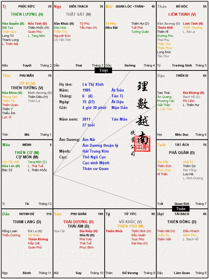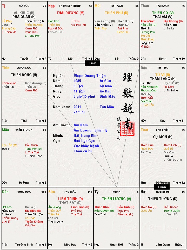 Cậu Khiêm thiên cơ thủ thân mạng tuần triệt đồng cung, đây là cách khá kiêng kỵ. Cung quan cự hãm việt mã quyền nên học hành sáng dạ, công việc thường có tính chất lưu động. Mệnh có tang hổ khốc hư hội chiếu nên nét mặt không tươi tắn, có năng khiếu ăn nói hùng biện. Cung tài đồng hãm hỏa tinh song hao, cậu làm ra tiền không nhiều nhưng hết lại có như nước có nguồn. Người có tuần triệt thường luôn cảm thấy không hài lòng với công việc đang làm, luôn nghĩ rằng với tài năng của mình phải làm những việc to tát quan trọng hơn, do đó không tận tâm với công việc dẫn tới tình trạng đứng núi này trông núi nọ. Cung phúc vẫn bị không kiếp đà hỏa khốc, may có khoa khôi nên cậu cũng được hưởng một phần cát khí các văn tinh do đó cũng có những kết quả nhất định. Cung thê đà la không kiếp, hôn nhân khá lạnh nhat, vợ chồng có thời gian sống xa nhau khá lâu.bvdpat đã viết:Cam on Dao si that nhieu