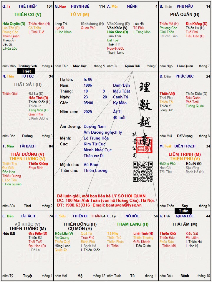 Ở trang 319 cháu có hỏi về LS của bạn trai cháu. Bạn ấy sinh 23/10/1985 DL nhưng đã được gia đình di cung hoán số sang 23/10/1986. Vậy LS của bạn ấy tính theo năm 85 hay 86 ah? Là năm nào thì cháu xin nhờ bác xem qua LS bạn ấy theo năm đó và nhờ bác xem giùm cháu và bạn ấy có duyên với nhau ko ^^ (mong bác giành time giúp đỡ ^^)