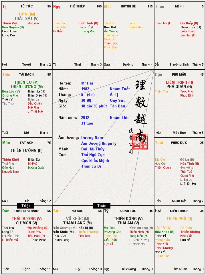 Lá số này không biết có con chưa, nhưng đường con cái có vẻ nên chăm lo hơn.Robert đã viết:Dạ cảm ơn bác đã nhắc, đúng là cháu đã lấy sai lá số thật ạ. Đây là lá số đúng của cháu ạ . Nhờ bác xem giúp cháuTây Đô đạo sĩ đã viết: @Robert: Lá số của cậu rất tốt, có lẽ cậu lấy ngày giờ sai chăng? Nhớ là ở đây lấy theo ngày dương lịch nhé.