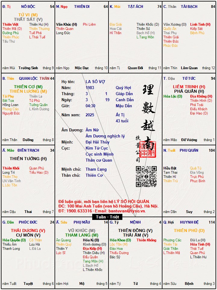 Tại đại vấn có Liêm Tướng, Thai phục vương tướng nên vậy ( e là có sản phẩm). Cung Thê cớ Cơ chủ thay đổi, Không kiếp, kình linh kị đẩu, đà hỏa hội chiếu là điều rất đáng lo ngại. Xung chiếu có Quan Quý, Tam đức hội chiếu, Đại vận Thiên phúc, thanh long địa giải, giải thần hội chiếu là điều báo có thể cứu giải.