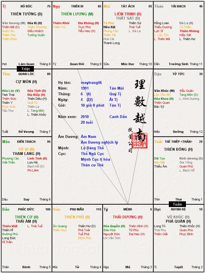 Thanh Hương xin nhờ anh MTP luận giải giúp em lá số. Em gặp trắc trở tình duyên quá. Xin hỏi năm bao nhiêu tuổi em sẽ lấy chồng? Chồng em là người như thế nào? Làm nghề gì và kém em bao nhiêu tuổi? Thanh hương xin cảm ơn anh nhiều!