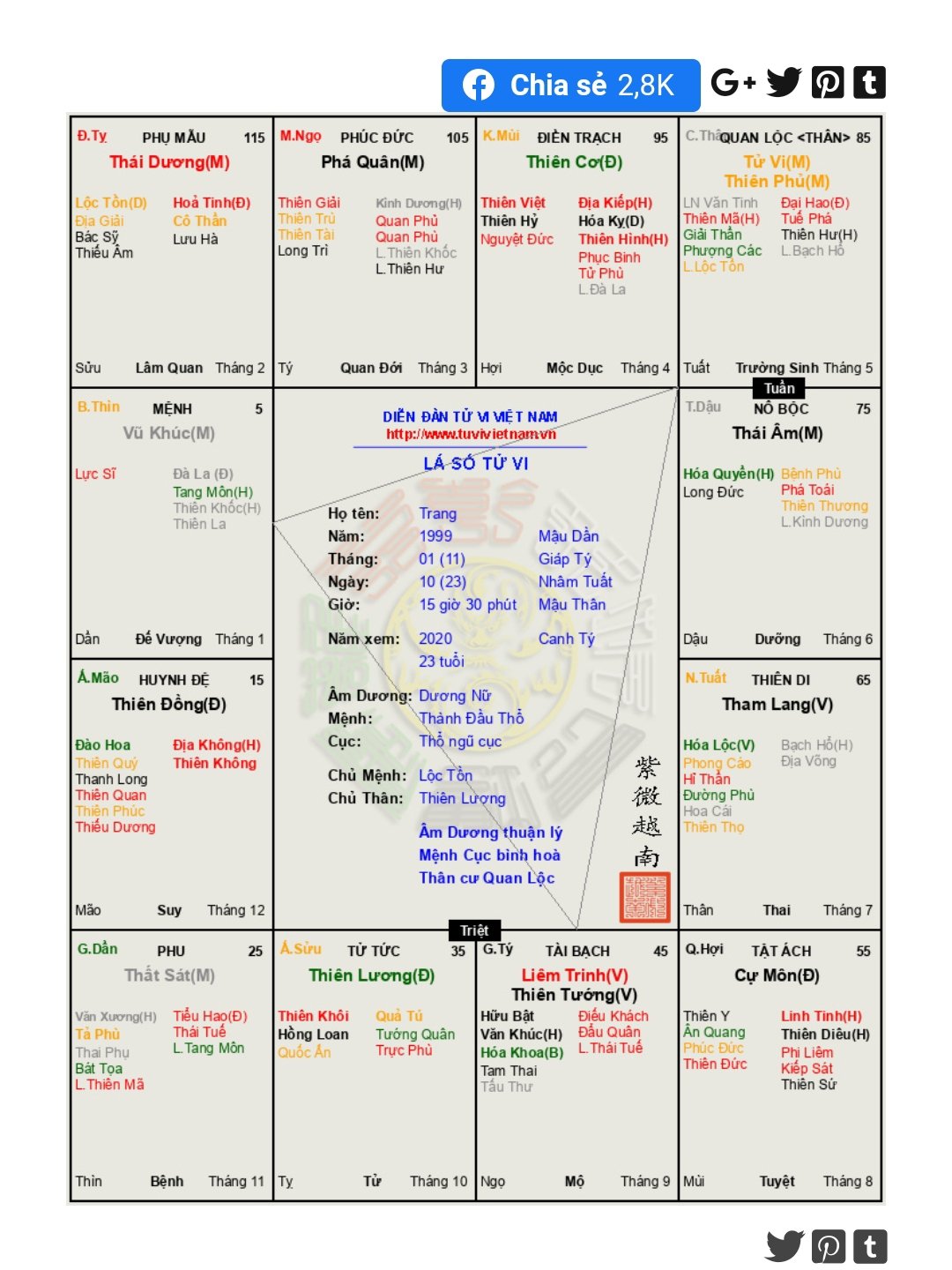 Chị ơi. Nhờ chị xem giúp em. Em rất muốn định cư ở nước ngoài sau này thì lá số này của em có số xuất ngoại không ạ. Với cung quan và cung tài của em bị tuần triệt đóng có thành cách cục xấu không ạ?