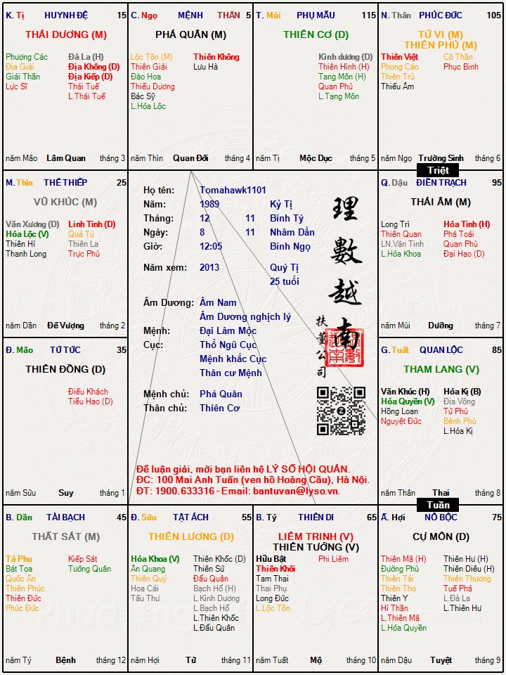 Đây là lá số của tôi, rất mong mọi người cho vài nét cơ bản về vận hạn xấu năm nay để tiếp tục trên con đường mới, nêu cả hạn tốt cũng được, ko thì cũng ko sao