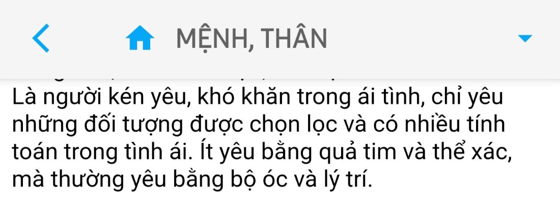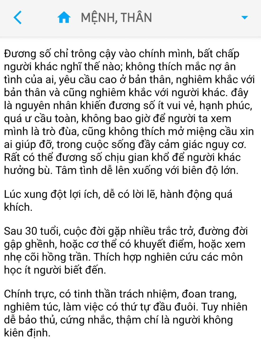 Thứ 3 em không thích nhờ vả trong công việc của em. Dù có người làm, em cũng không cần họ trừ khi công việc quá sức. Cái này, thường thì công việc của em phải thu dọn hàng hóa nhiều khi tan làm, có nhiều hôm thật sự người em rất yếu, hay chuyện không vui. Em vẫn chả muốn nhờ vả người thân gì, cứ một mình mà làm dù rất mệt. Tâm trạng lúc lên lúc xuống dù em chả biết tại sao. Chuyện này thường xuyên luôn ạ không phải chỉ một số vụ. Và dòng cuối nó rất dõ cái cách em làm việc và cái thiếu kiên định rất dõ. App có luận giải sau 30 nhưng em nghĩ bây giờ đã có phần đúng vì em kiểu xem nhẹ hồng trần r ấy. Giờ em nhiều lúc có chuyện gì cứ nghĩ đơn giản "có ăn, có mặc, có gia đình, có tiền để tiêu là hạnh phúc r" chuyện gì đến không để ý