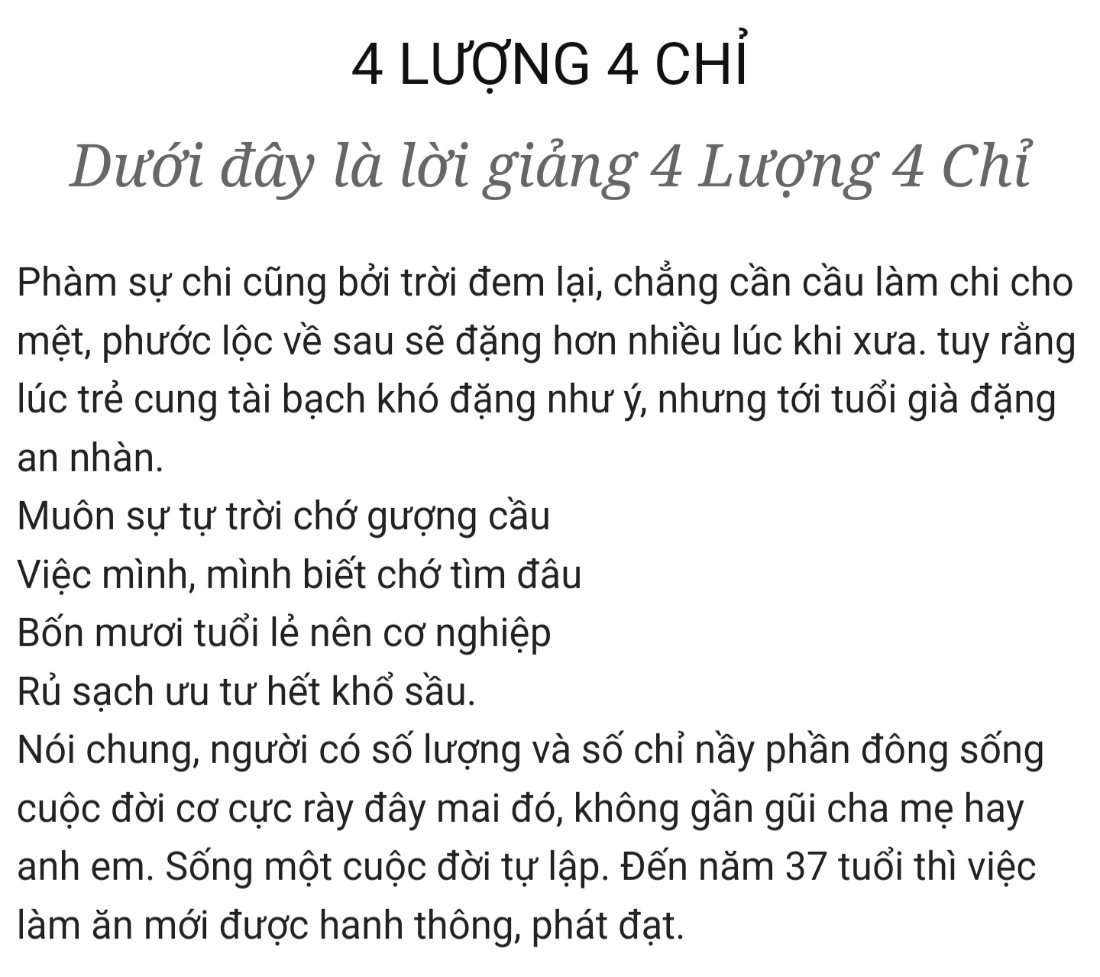Thứ 6 về cân lượng của em là 4 lượng 4 chỉ, trên trang tử vi cổ học ng ta luận giải giống như về hoàn cảnh từ nhỏ đến lớn của em rồi. Hoàn cảnh của em ở phần giới thiệu. Em xin hết! Cám ơn m.n đã đọc!