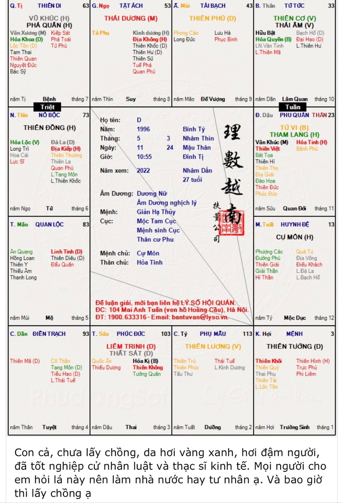 Em con cả, hiện tại chưa lấy chồng, da hơi vàng xanh, hơi đậm người, đã tốt nghiệp cử nhân luật và thạc sĩ kinh tế. Hiện đang làm ở pháp chế của cơ quan nhà nước. Theo các bác lá số này thì em nên làm nhà nước hay ra ngoài ạ. Và bao giờ lấy chồng ạ