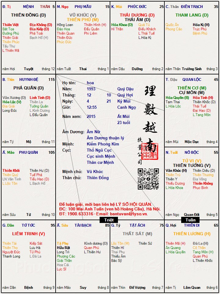 Con cảm ơn bác Vio đã xem cho con.vio đã viết:Bạn mệnh kim trên đất thổ, lại có cục sinh mệnh, nên bản thân bận là người có ý trí hăng hái vươn lên trên cuộc sống trong mọi hoàn cảnh. Bạn mệnh phá quân tại thìn ngộ địa không nên có thể thấy bạn la người thông minh, rất mạnh mẽ trực tính, trong nhóm bạn bè thường làm "đại ca", sống có trách nhiệm với mọi người. Bạn tuổi quý dậu nên phá quân sẽ hoá lộc và cung tài bạch sẽ có lộc tồn, ở đất hoá lộc địa không lộc tồn gặp triệt nên có thể thấy vận tài lúc thịnh lúc suy, kiếm ra nhiều tiêu cung nhiều, đồng tiên luân chuyển, kết hợp với tính cách và nội lực, bạn phù hợp với nghề kinh doanh đầu tư, buôn bán.