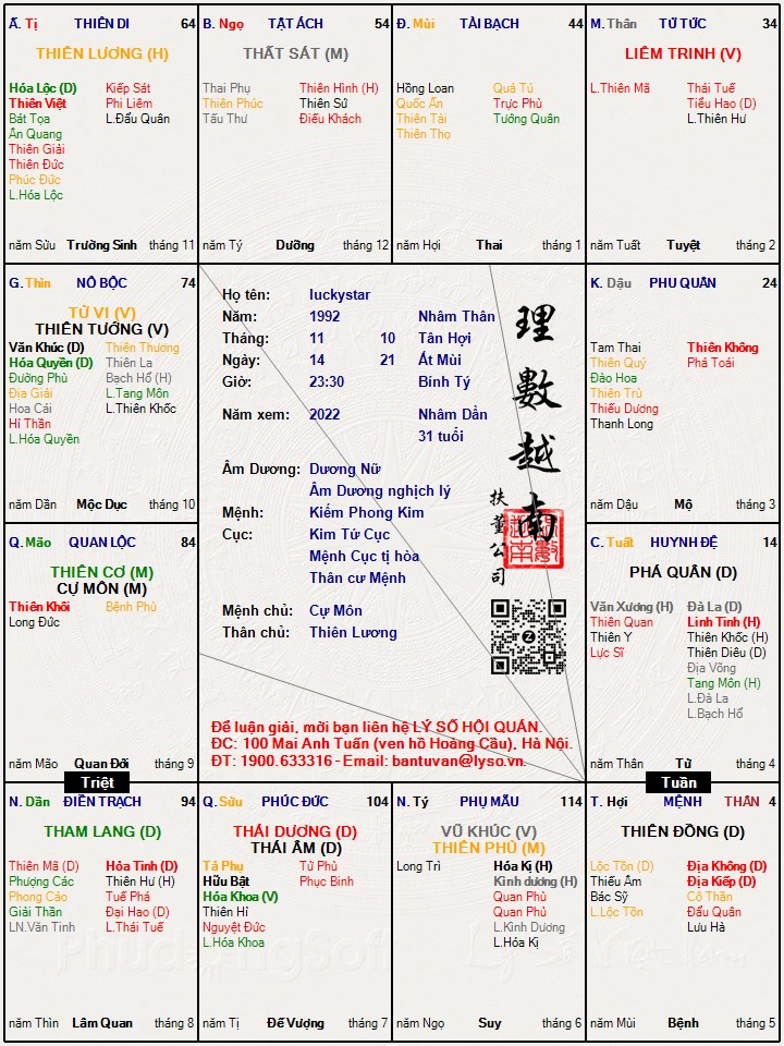 TL: Mong các bác cao nhân luận giải giúp lá số này ạ: năm nay vậy hạn ra sao ạ. Cảm ơn các bác