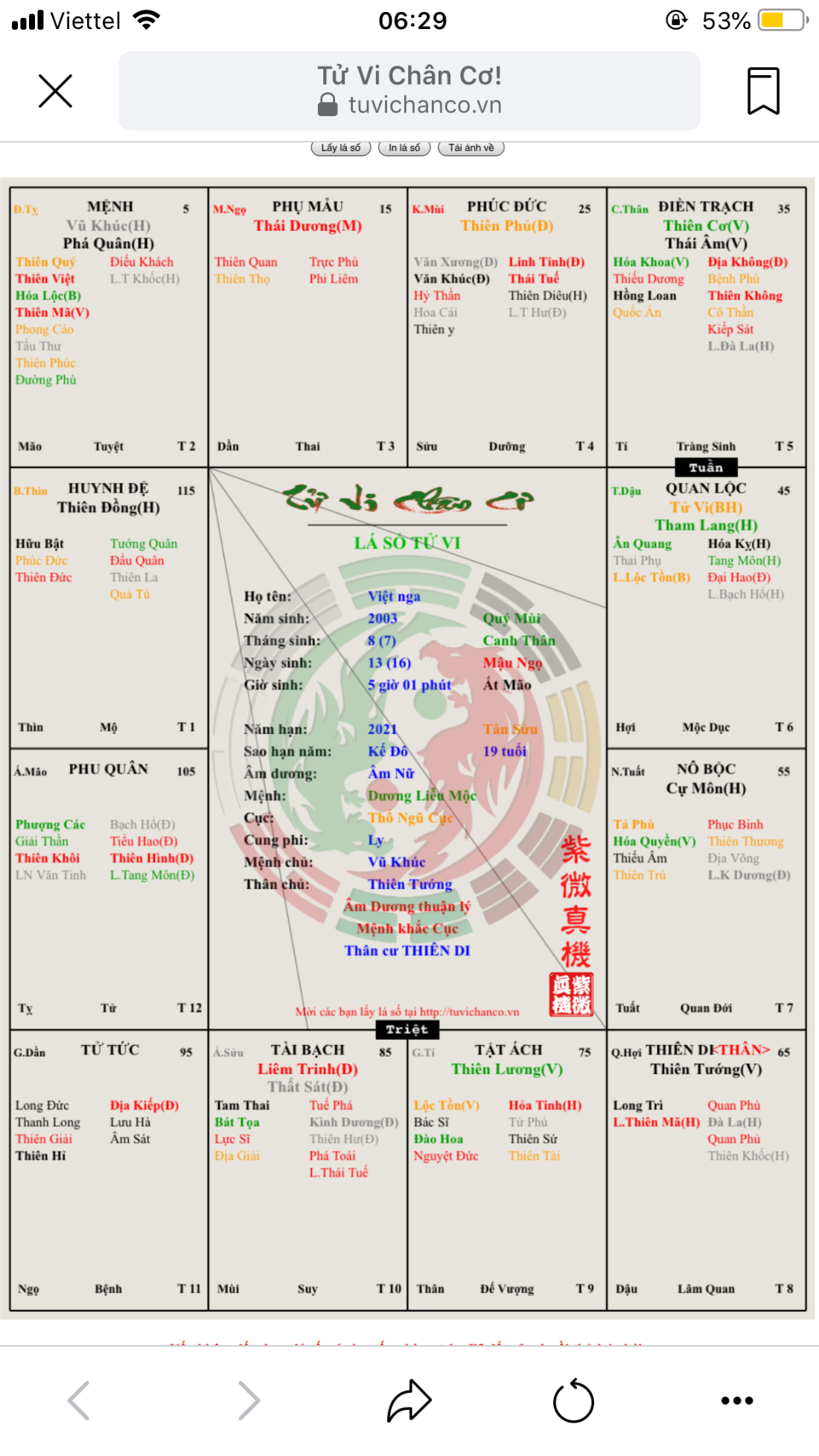 Dạ e cảm ơn vậy nếu đỗ tầm kinh tế quốc dân hoặc bách khoa , học viện tài chính gì đó thì e sẽ khuyên ở nhà học còn ko thì cho đi xklđ nao có tiền thì tự quay lại mà đi du học ạYennamthien đã viết: 16:39, 23/06/21 Nếu trên lá số này thì tuần triệt đứng quan lộc và tài bạch thì thường là cũng không giầu được Quan lộc lại có hóa kỵ nữa thì cũng hay bị thị phi trong công việc nhưng nếu ko thì năm nay các năm sau mình thấy xấu hơn nhiều mà việt nam khi làm việc vẫn cần bằng cấp để làm cái vé vào cửa nên nếu cho bạn ấy học được thì cố cho bạn ấy học vì thân cư thiên di có thiên tướng miếu vượng thì sau này vẫn còn nhiều cơ hội đi nước ngoài có khi còn định cư vì cung thiên di đẹp có cả xương khúc khôi việt ôm vong thái tuế
