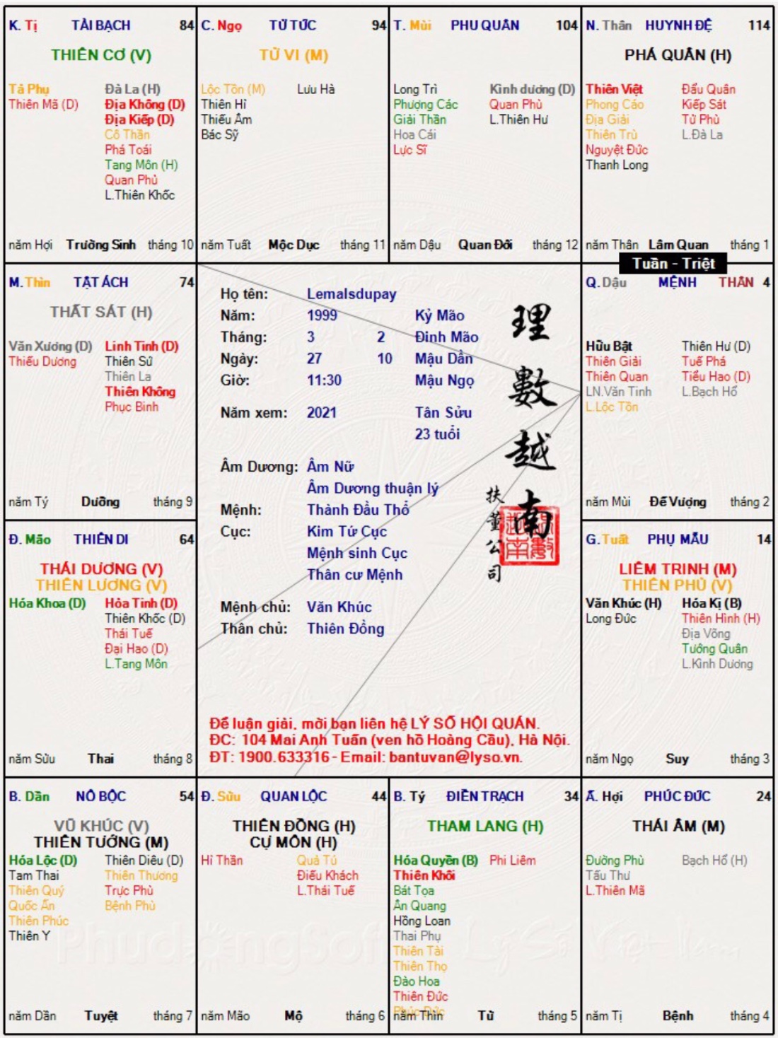 LS em vận đi cũng được.lemalsdupay đã viết: 15:14, 10/08/21 Anh chị cho em hỏi lá số này có cần lưu ý gì để cẩn trọng và sửa chữa cho tốt không ạ T.T tại cái nhân em suy nghĩ lo lắng rất nhiều, con đường học hành cũng ko ổn định, hy vọng anh chị giúp em chỉ ra điểm ko tốt để em khắc phục ạ