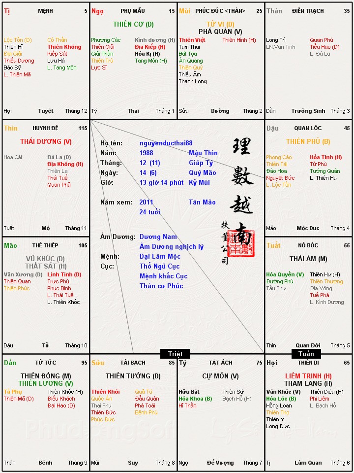 Bác Phượng Hoàng Lửa xem lá số của cháu với !!! số cháu NHẬT NGUYỆT PHẢN BỐI NGỘ TUẦN TRIỆT. Mệnh cháu có khổ lắm đúng không bác? Có người nói cháu sau này làm Quan hay Quân sư gì đó. Cháu giờ không rỏ thực hư thế nào. Mong bác giúp đỡ! cam on BAC.