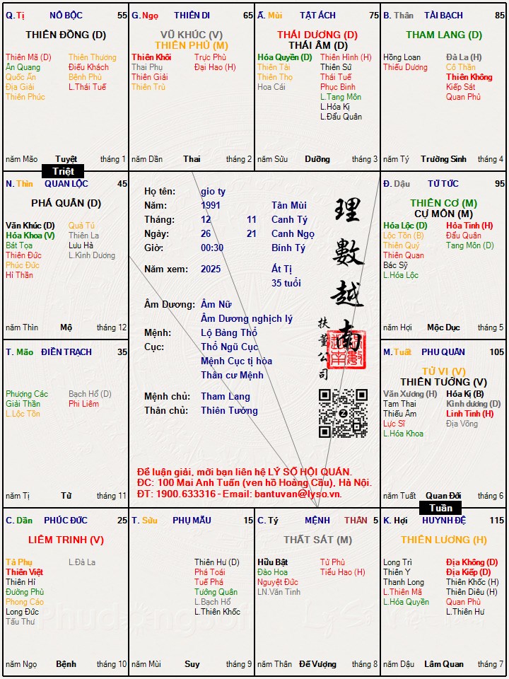 Năm sau là năm tuổi của mình. Lưu Thái Tuế gặp Thái Tuế tại mệnh. Lưu Lộc Tồn ở cung Tài. Lưu Thiên Mã gặp Thiên Mã, Lộc Tồn; Lưu Tang Môn gặp Tang Môn ở Cung Phúc. Lưu Thiên Khốc, Lưu Thiên Hư gặp Khốc Hư tại Thiên Di.