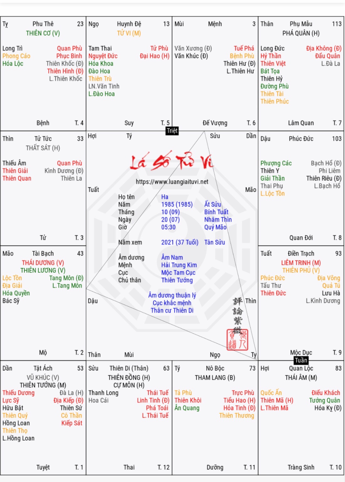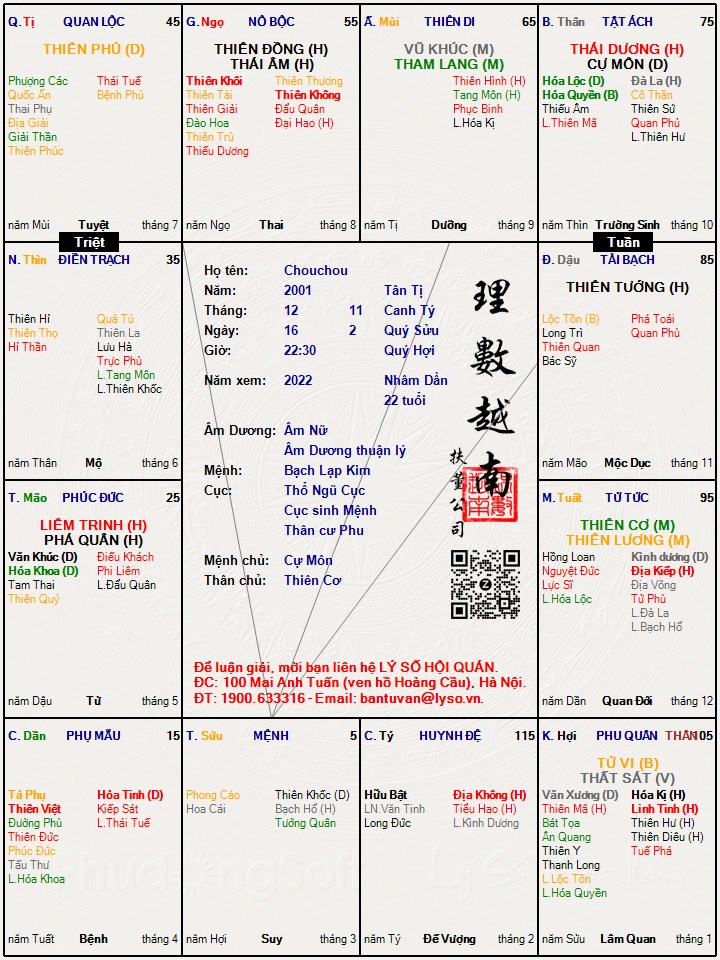 Nhờ bác nghiệm lý lá số này!bạn này hồi bé bị mổ 4 lần.Dokhoavan đã viết: 15:20, 07/08/21 Điều này lý giải vì sao chị Moon mệnh VCD ở Dậu có Cự Cơ ở Di chiếu về, lại không đi làm những nghề dùng tài ăn nói để kiếm tiền như bán hàng, ký giả,..., mà làm CEO, là do Tật có Tử vi Thiên tướng toạ thủ!
